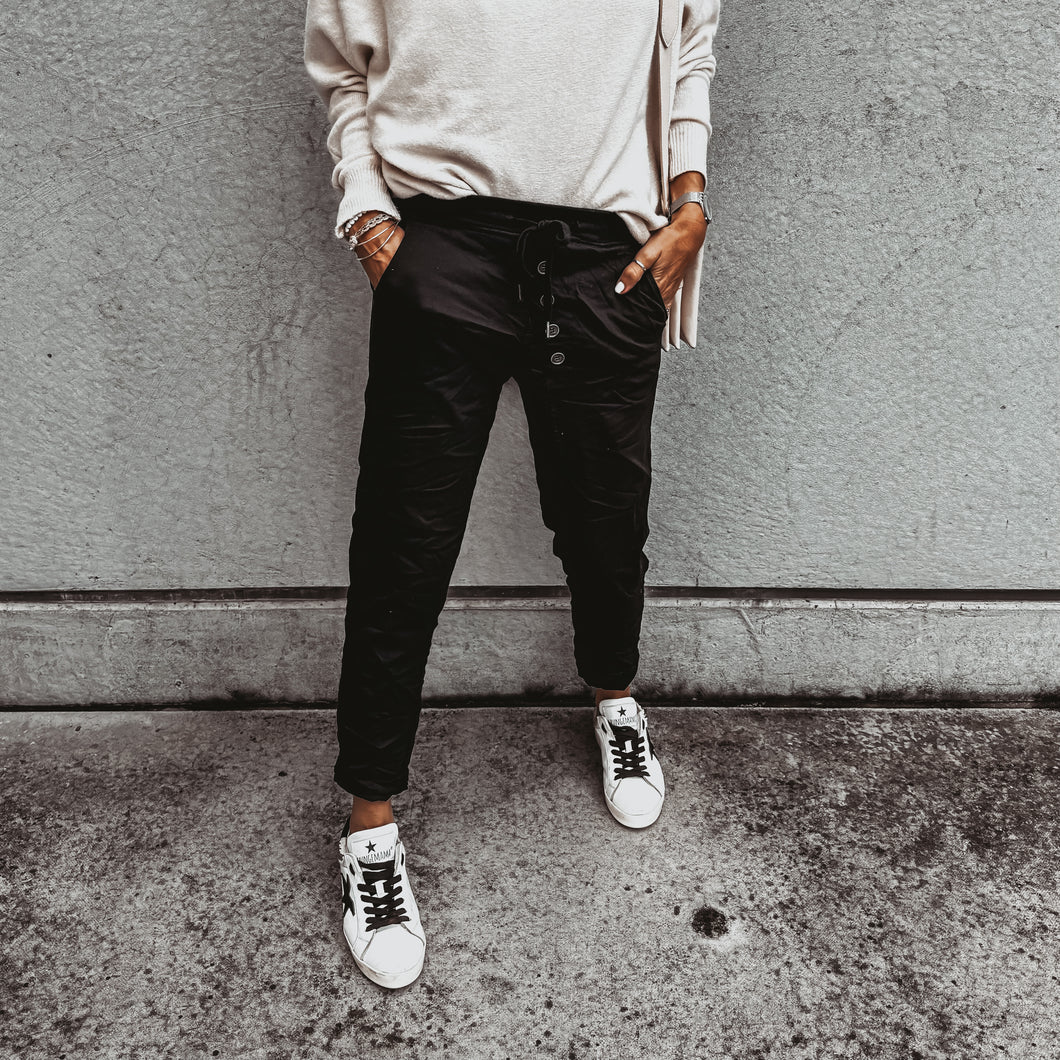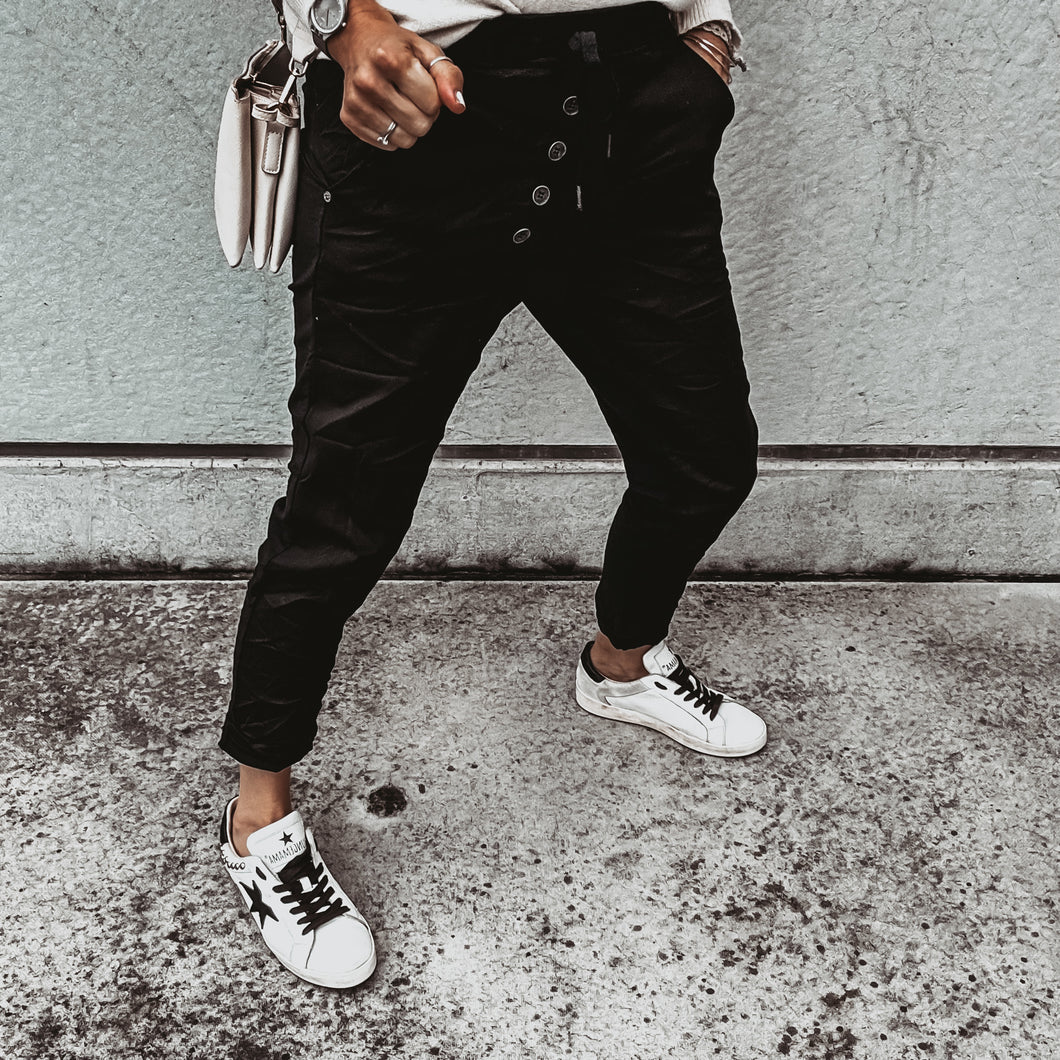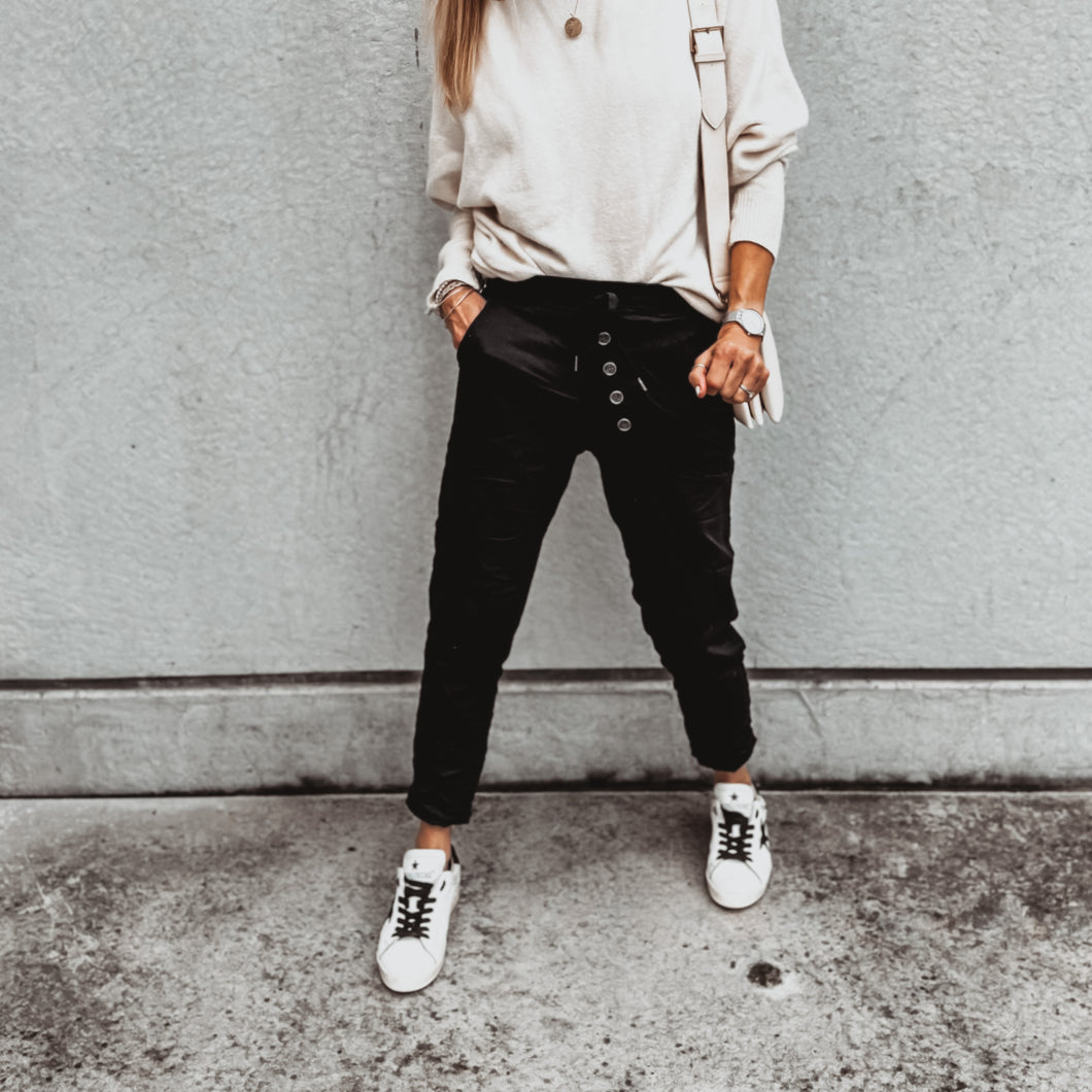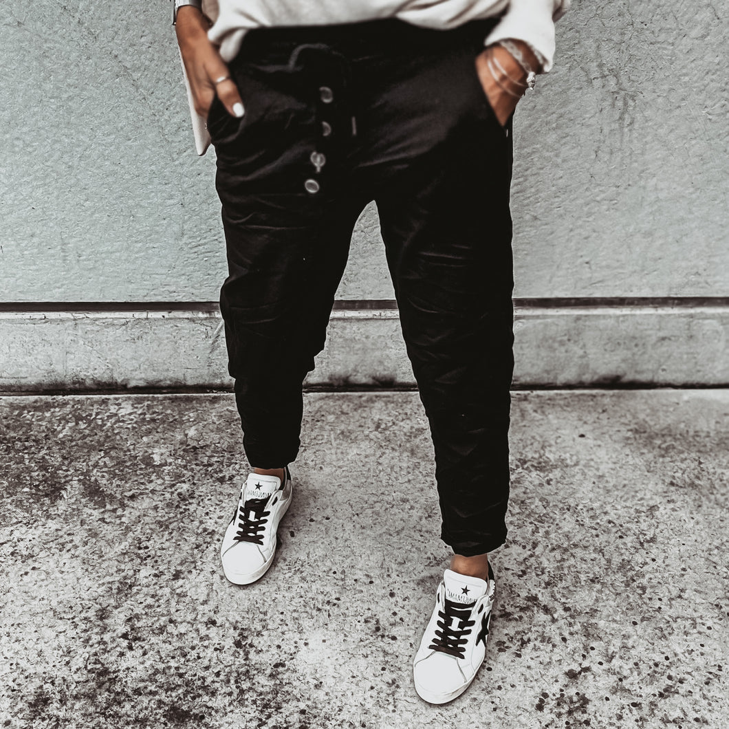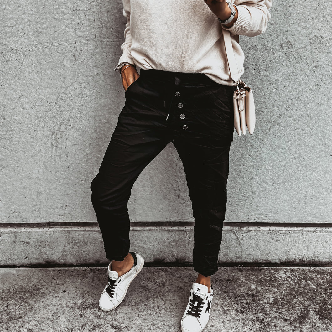 A super stylish and comfy jogger jeans with diagonal buttons. Pockets and a elastic tie waist.