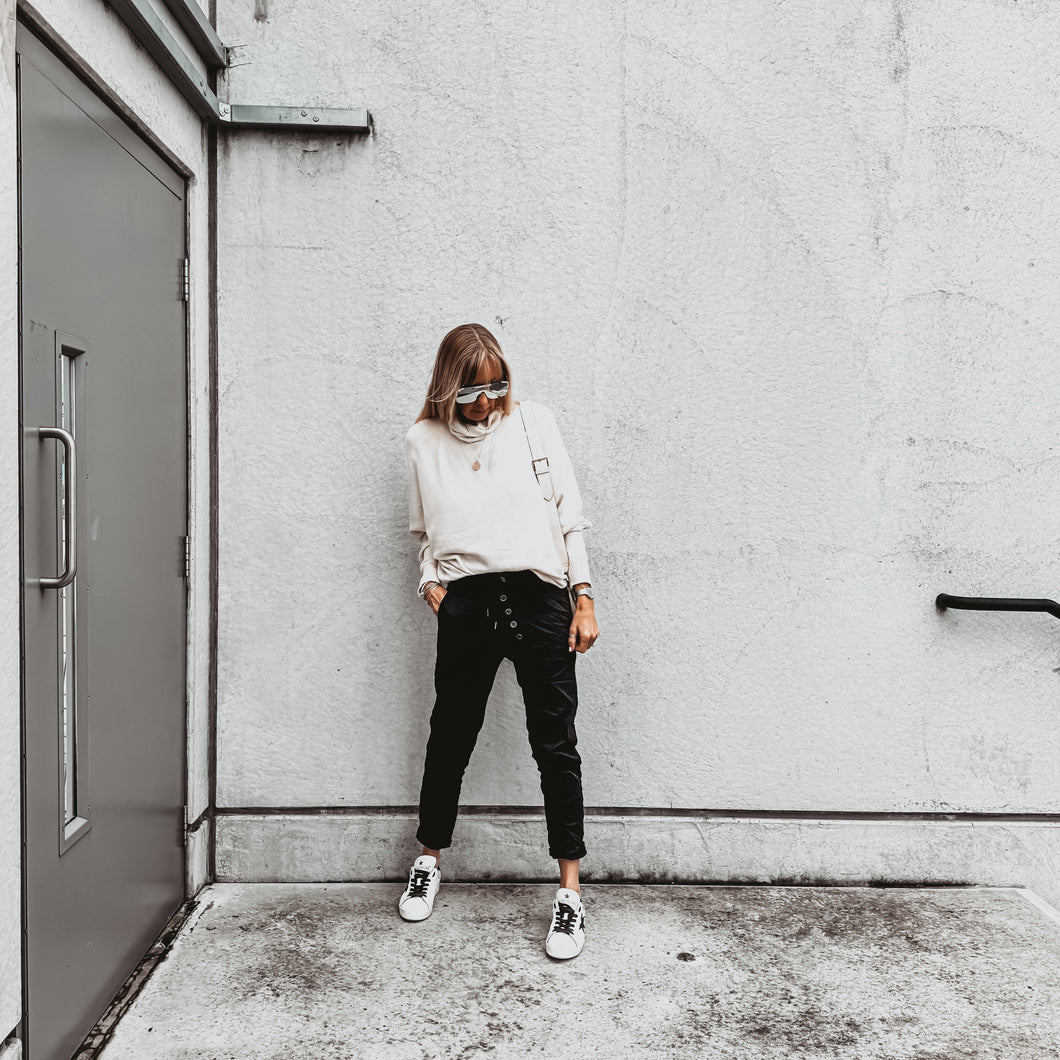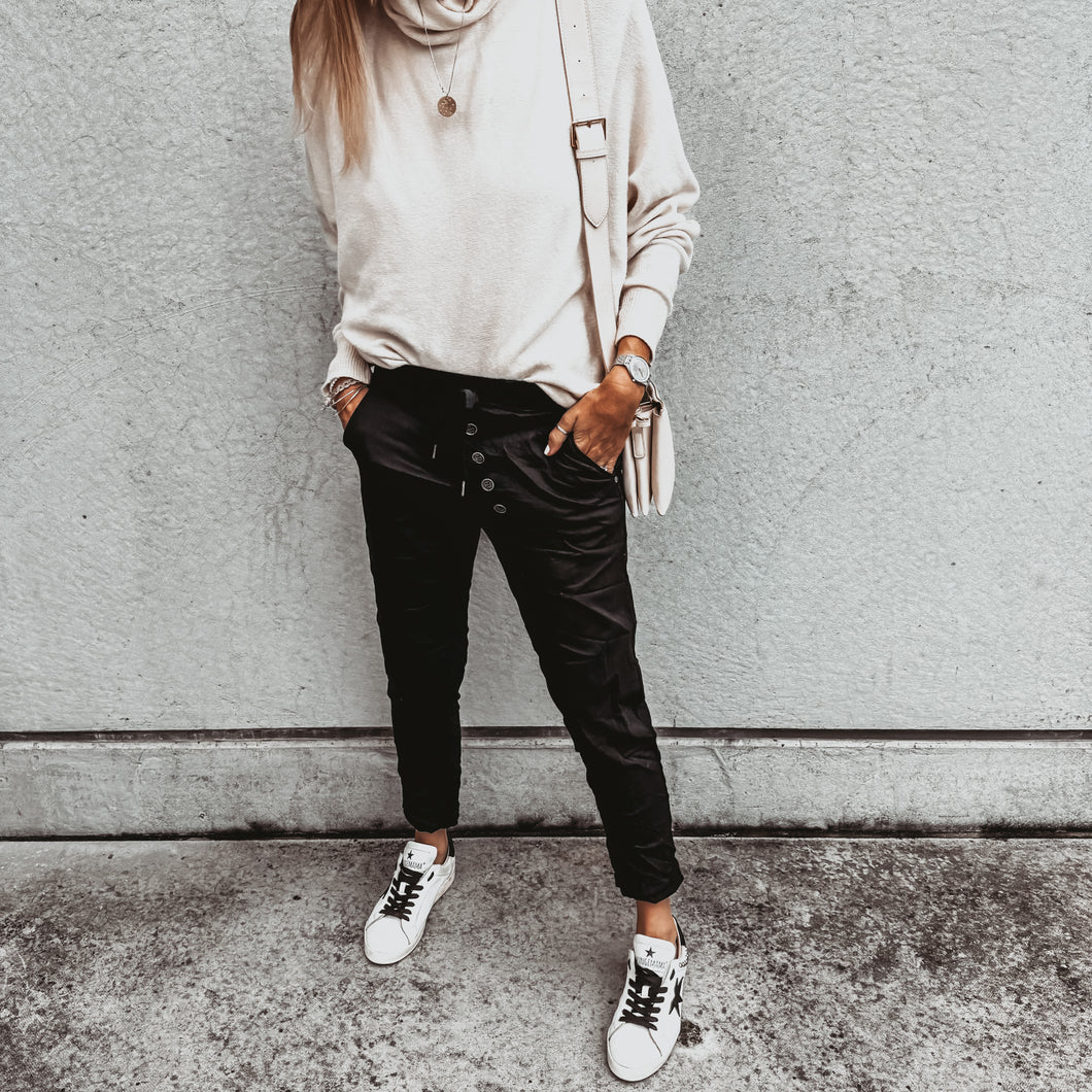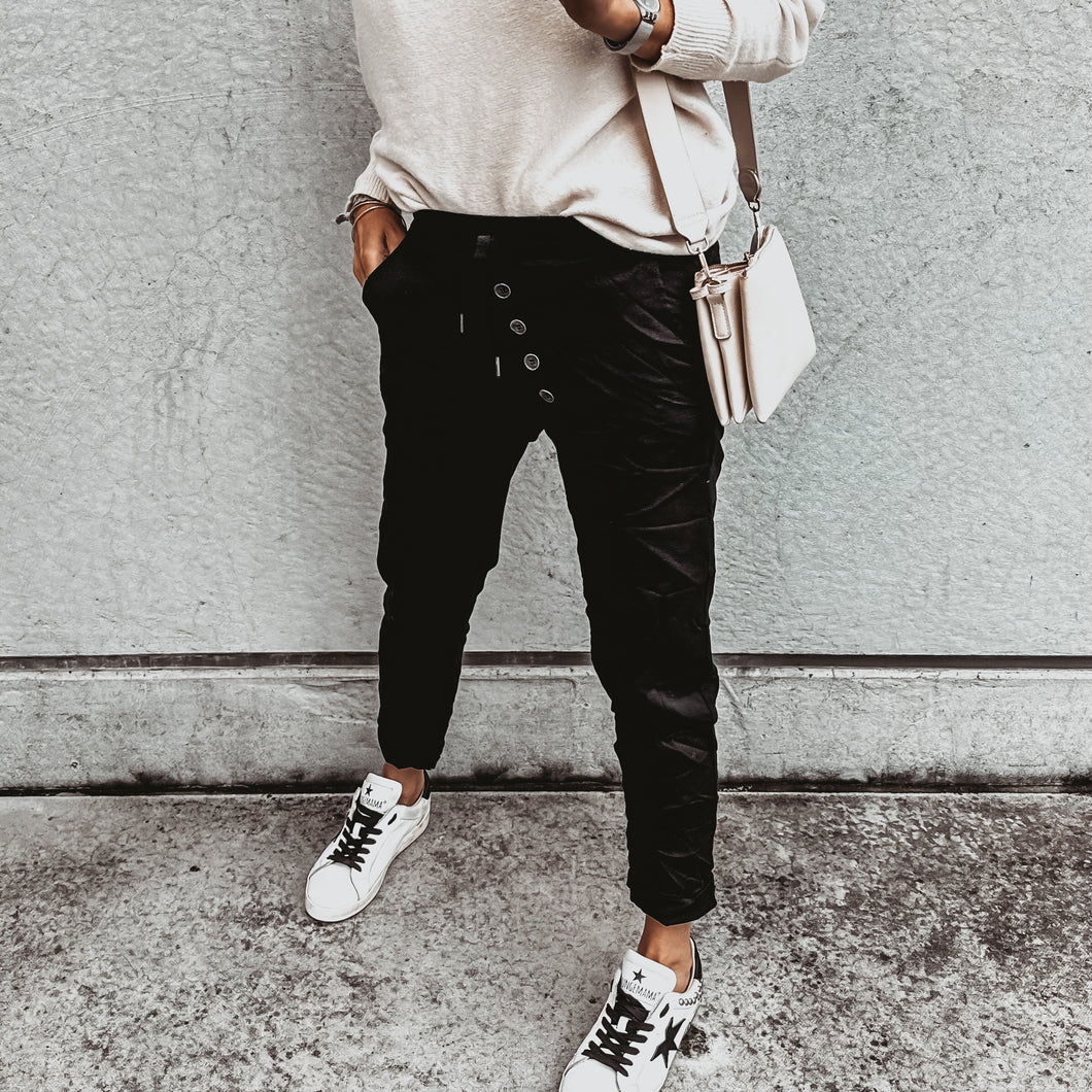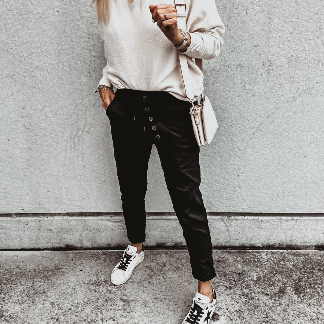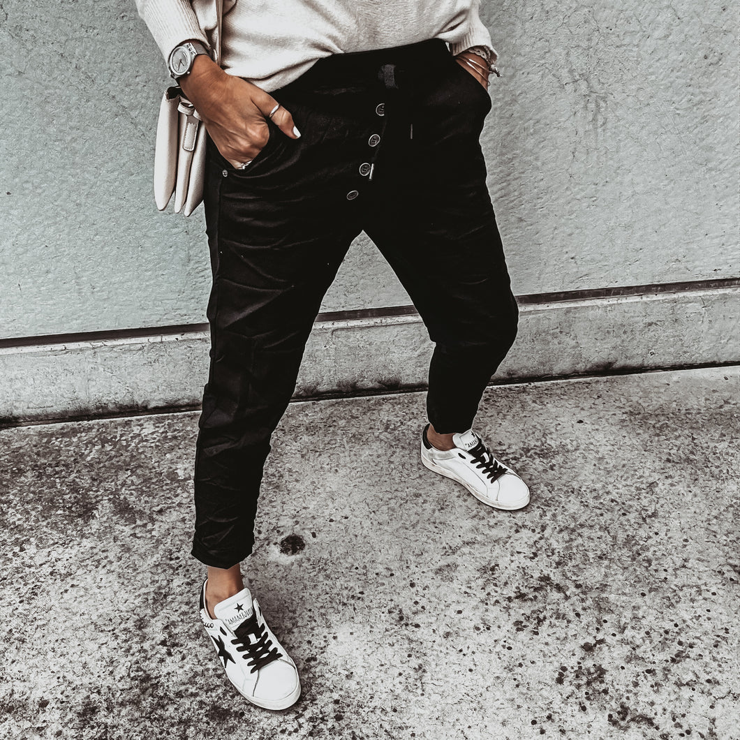 A super stylish and comfy jogger jeans with diagonal buttons. Pockets and a elastic tie waist.