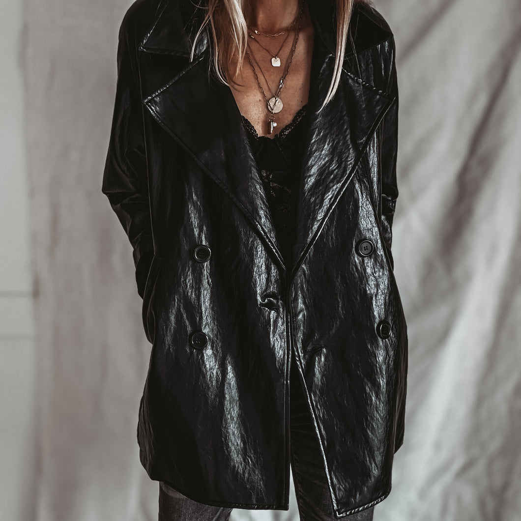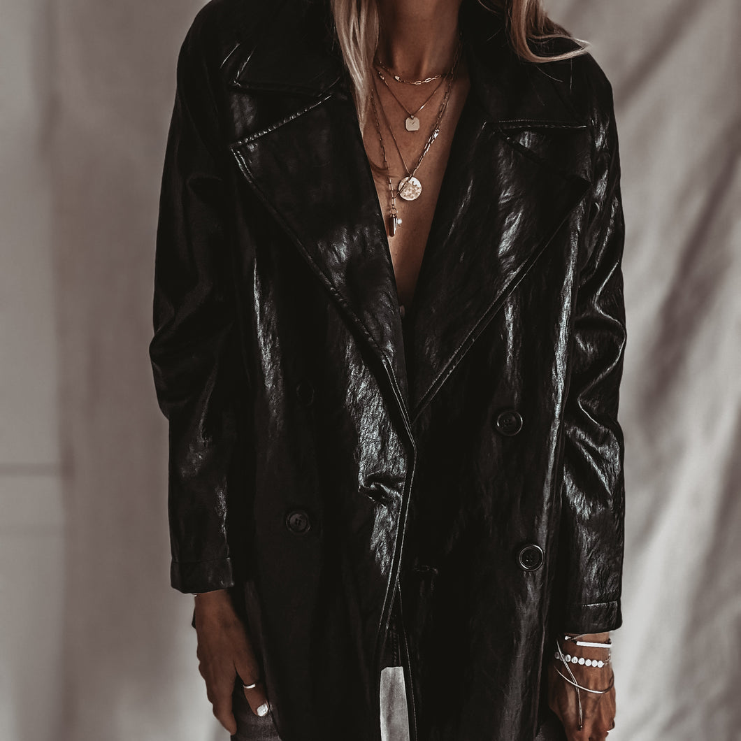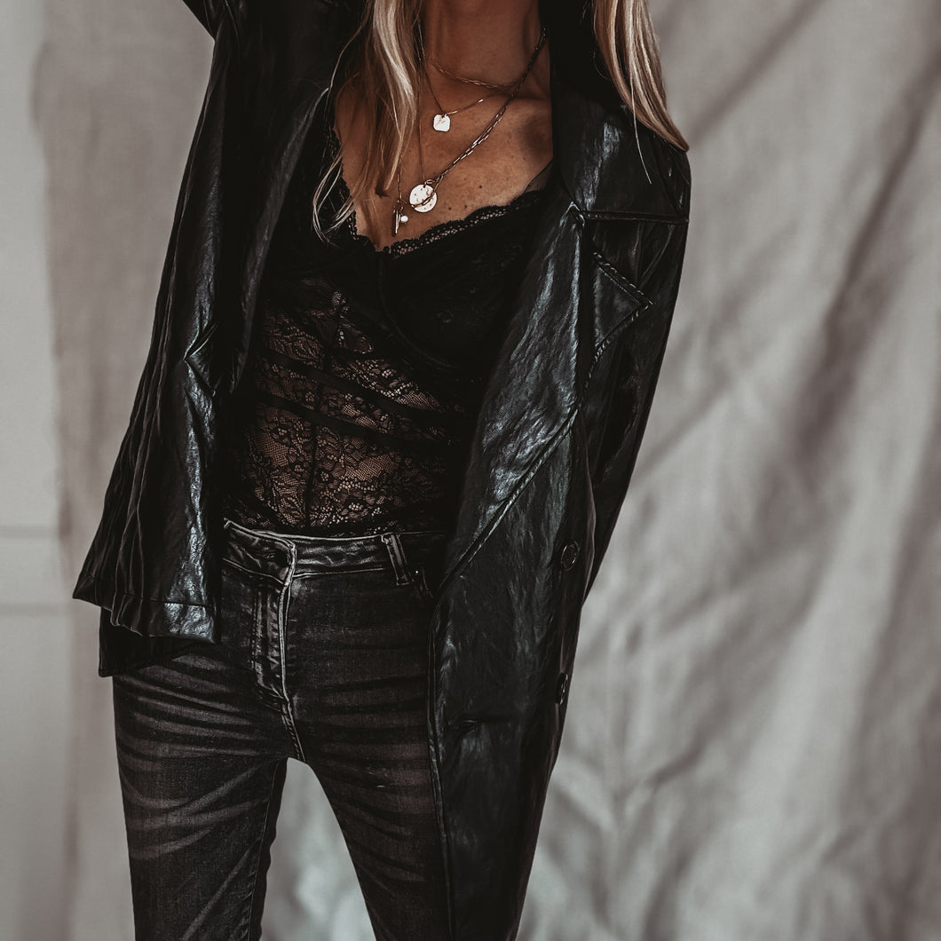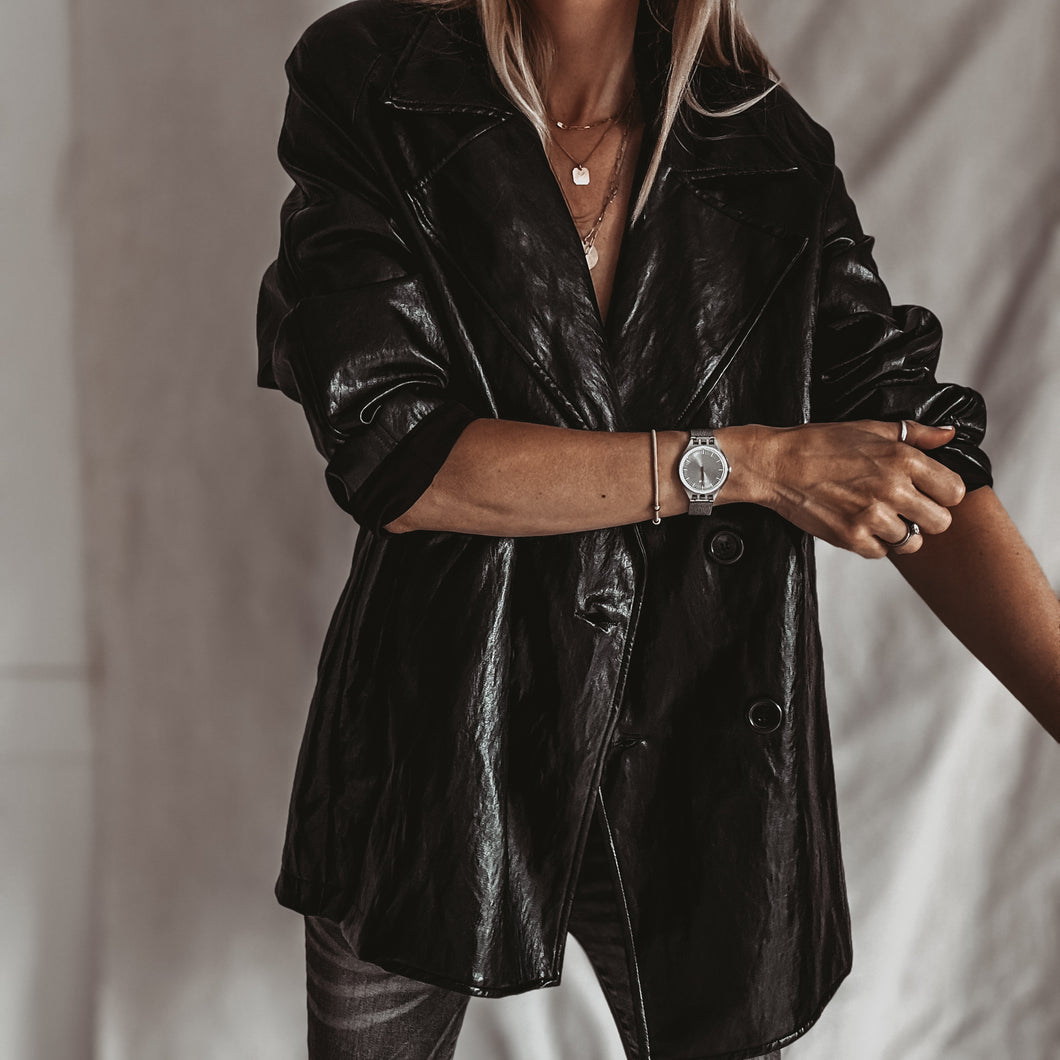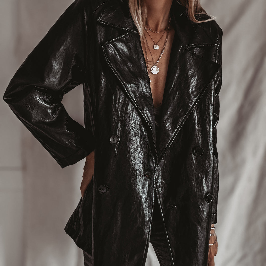 New in. A fabulous faux leather blazer with a touch of patent glamour, perfect for elevating pair of joggers or jeans if you're heading out to dress them up a bit!