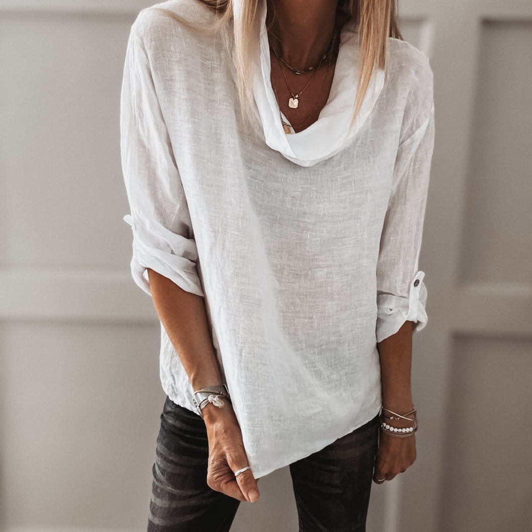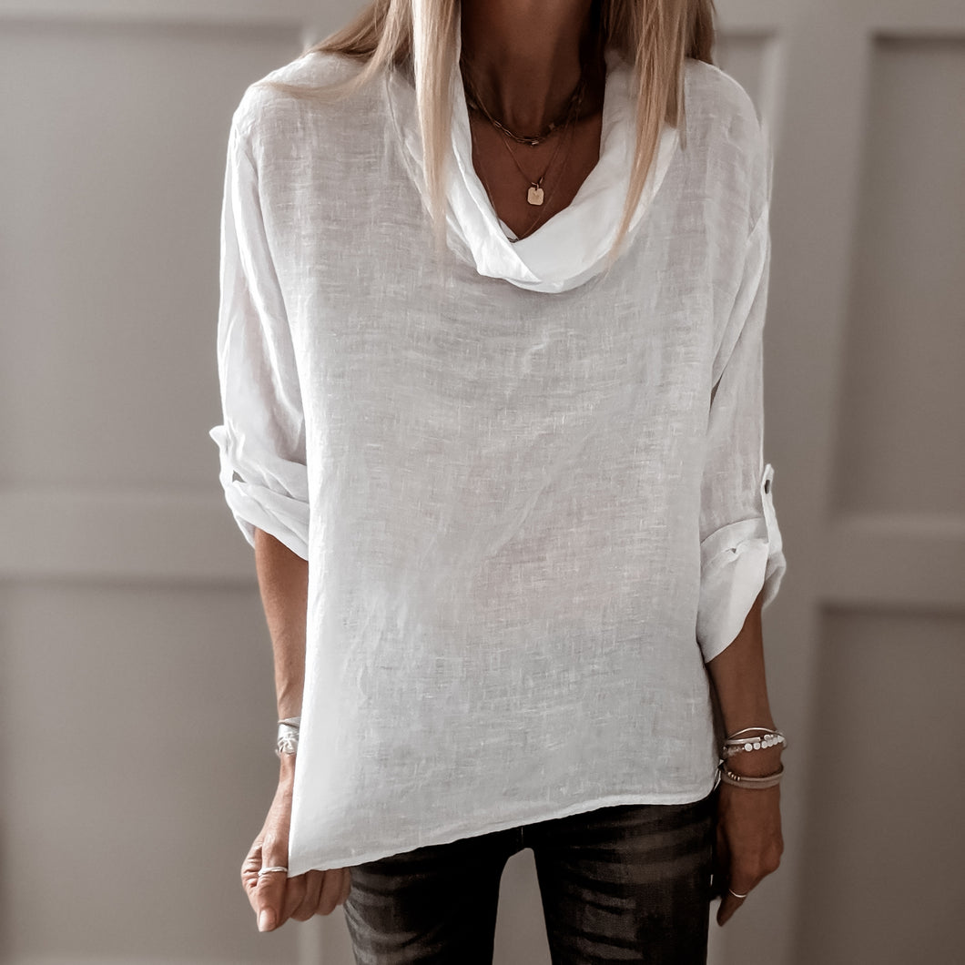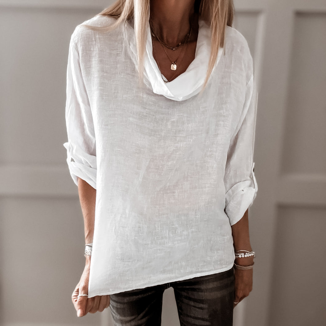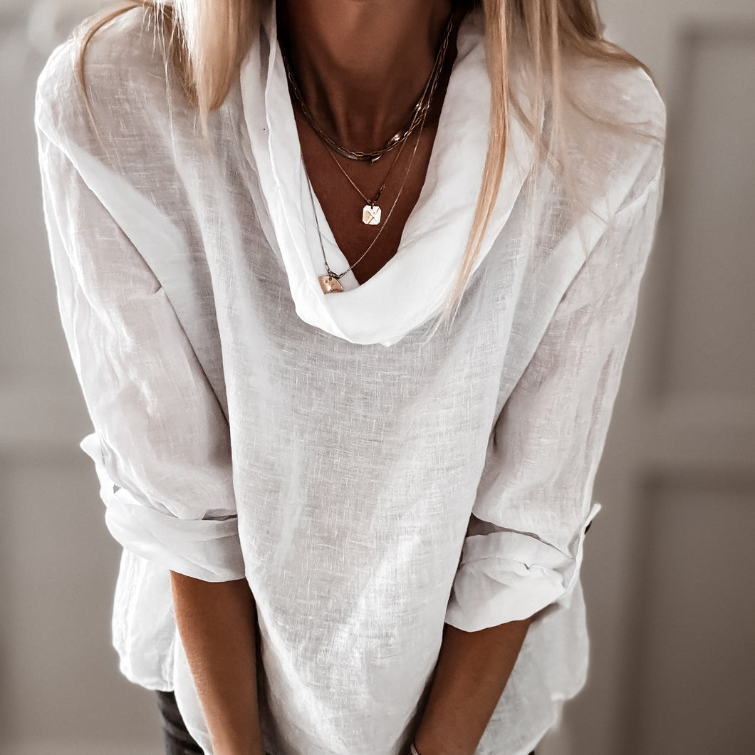 A gorgeous linen top with a cowl neck. Also available in beige.