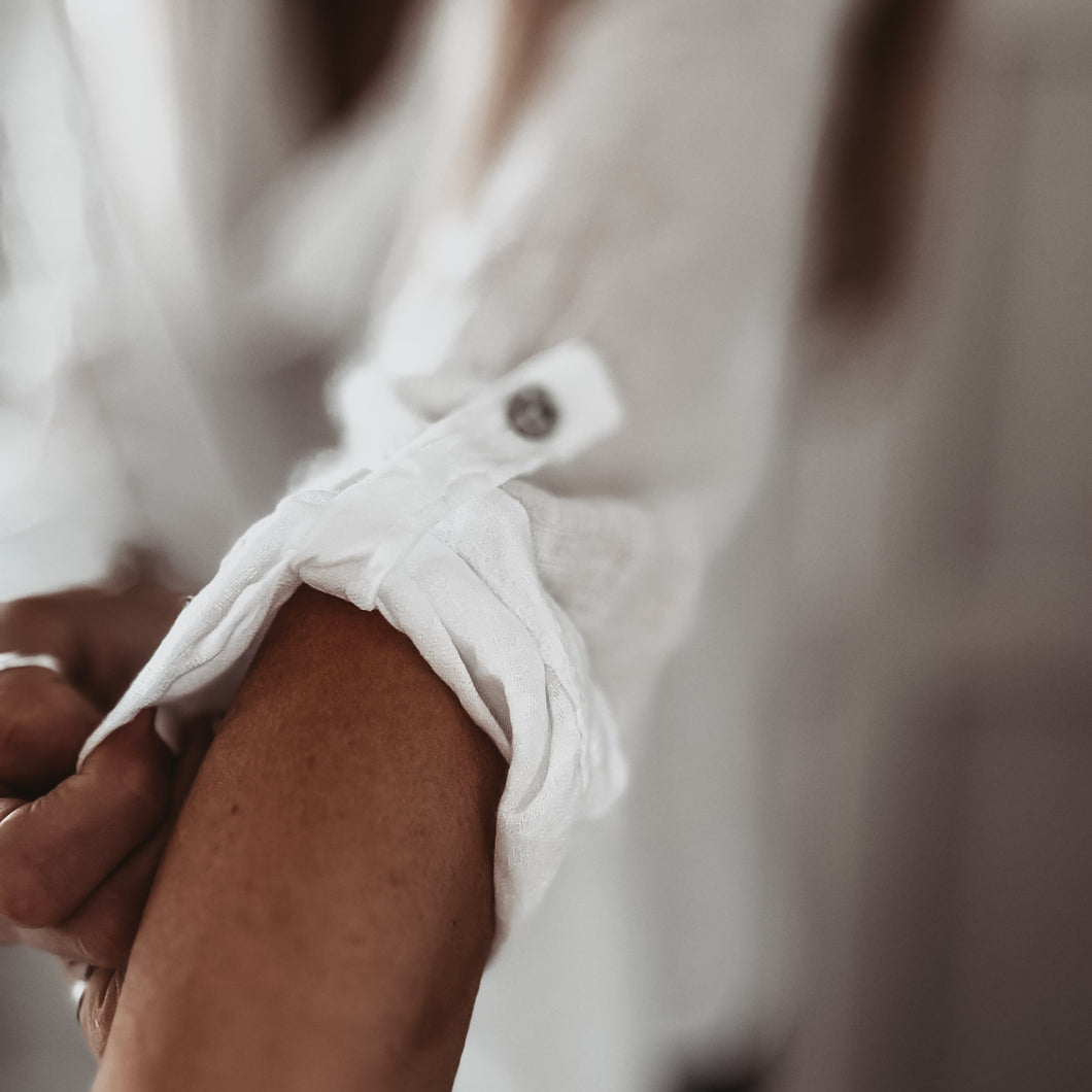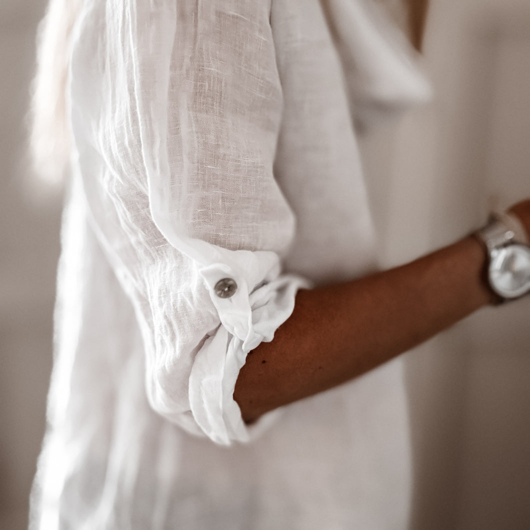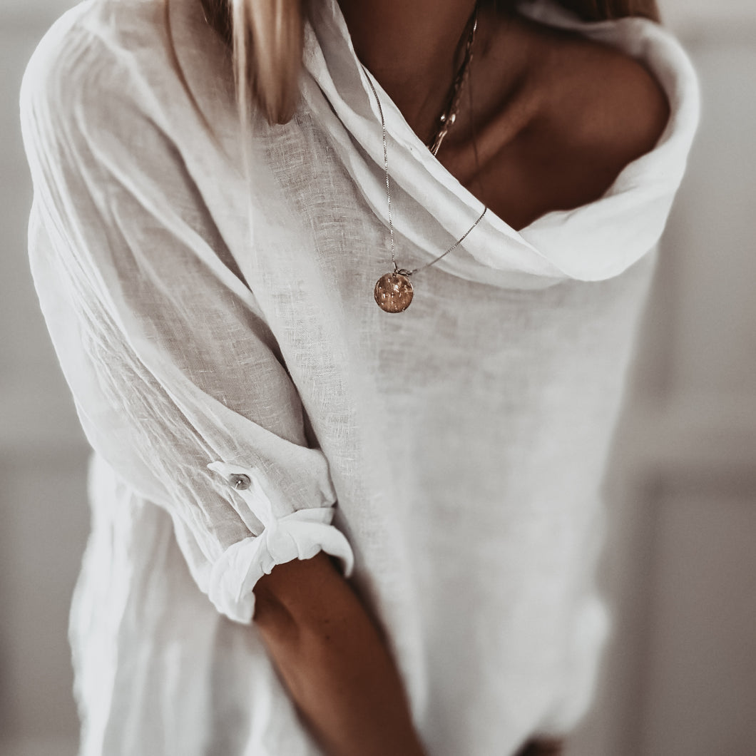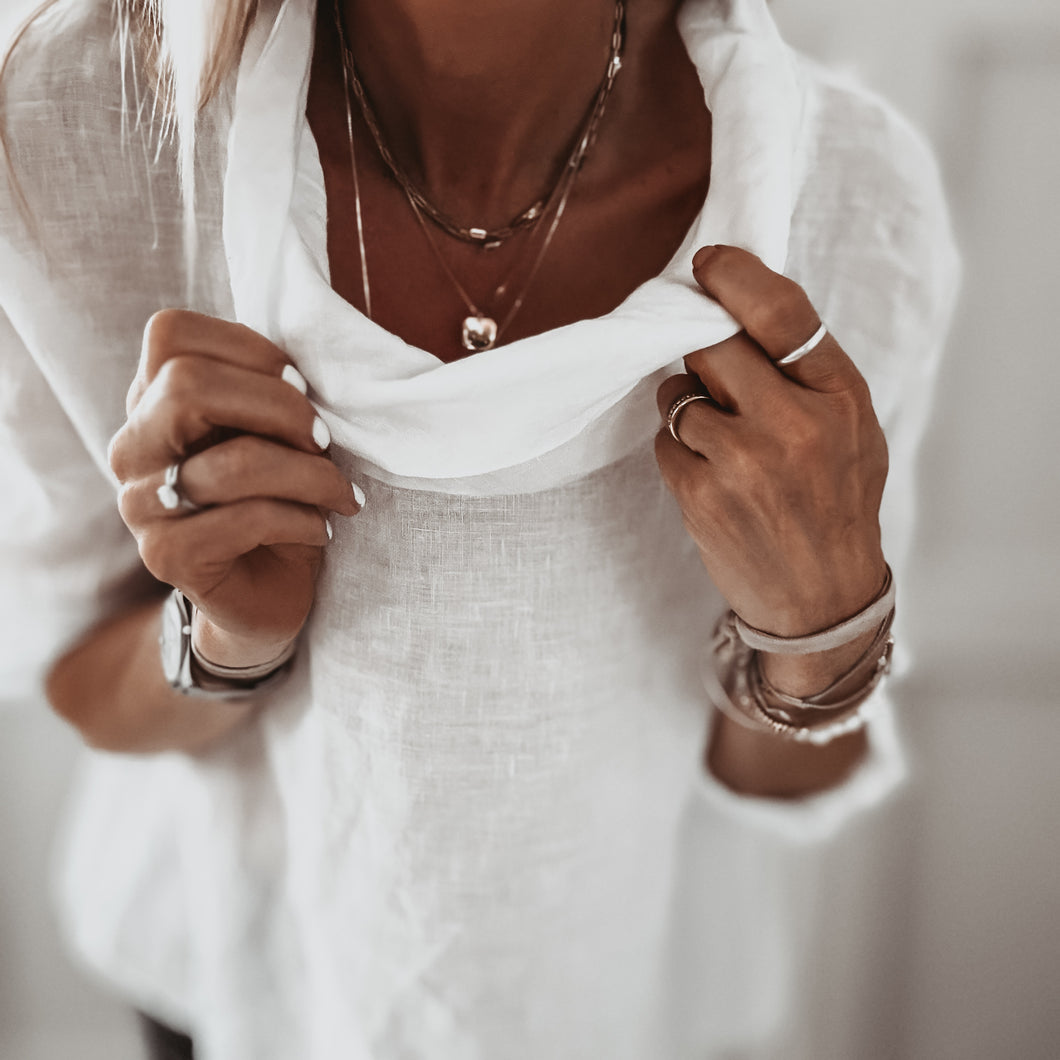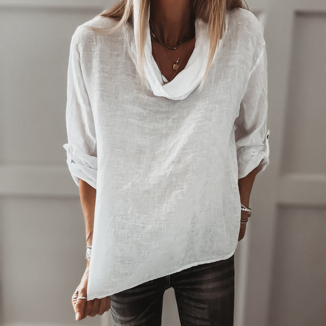 A gorgeous linen top with a cowl neck. Also available in beige.