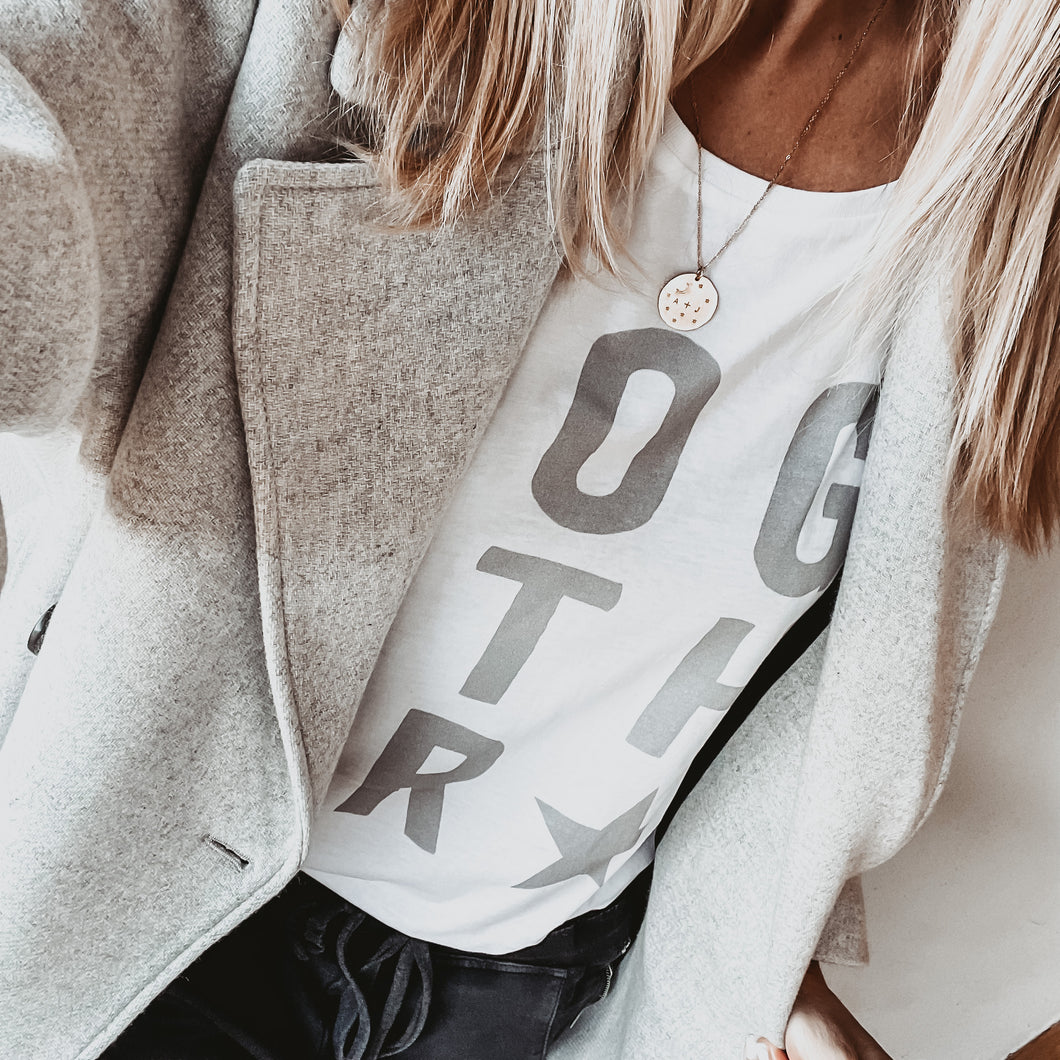 This tee is a lovely fit! Tighter over the chest and looser at the waist, very flattering.