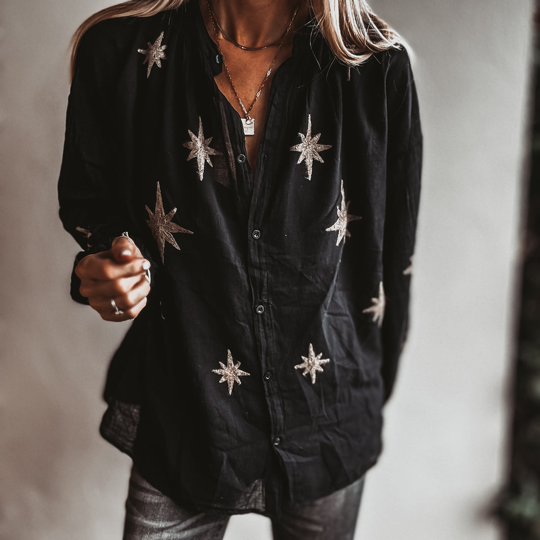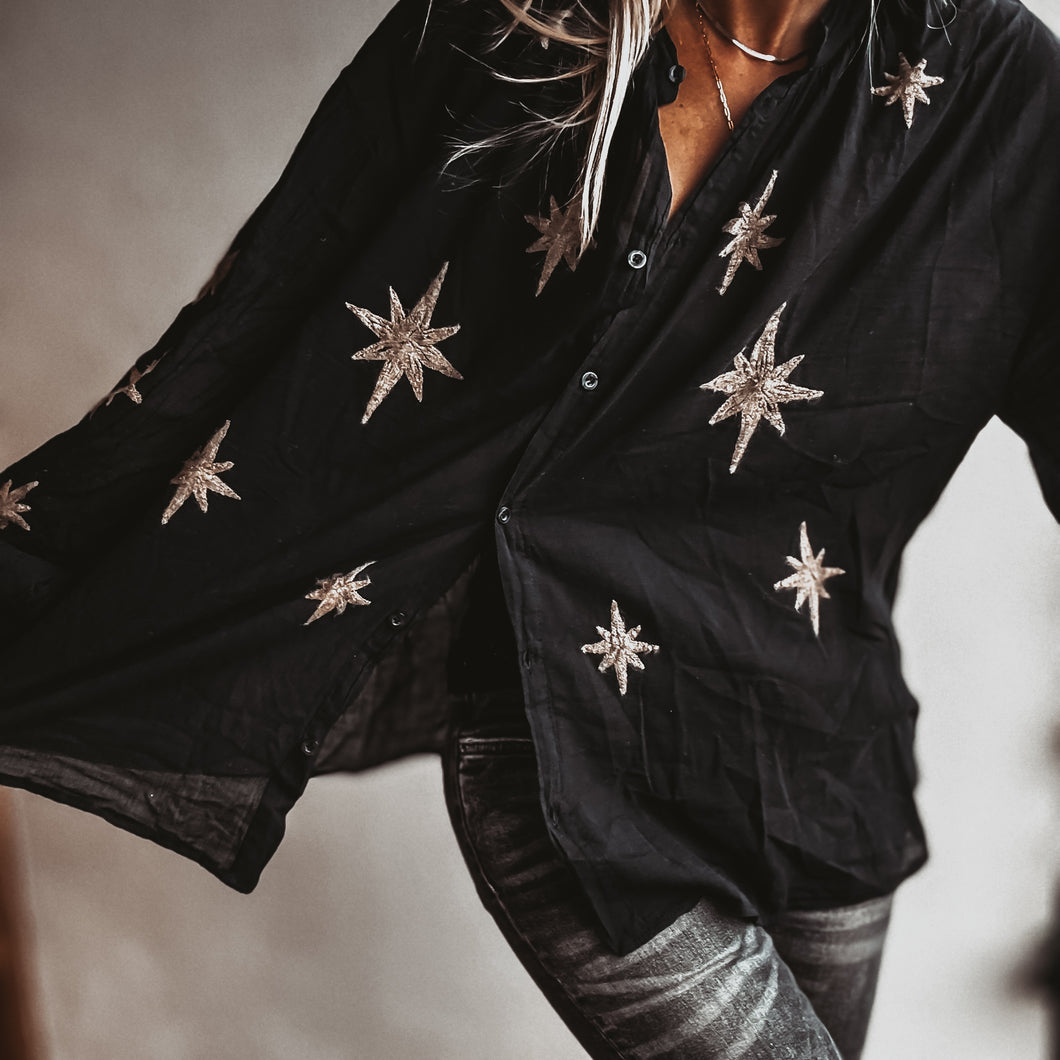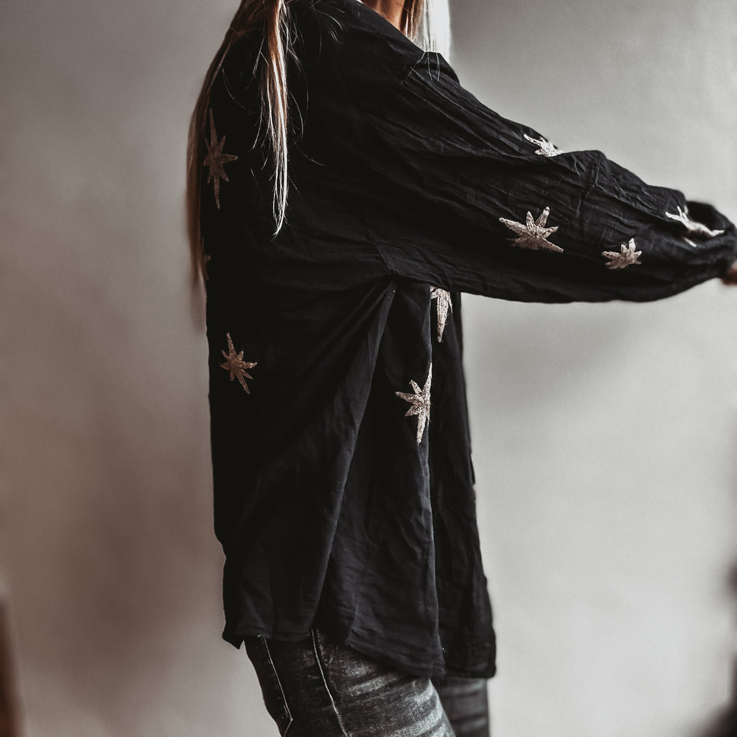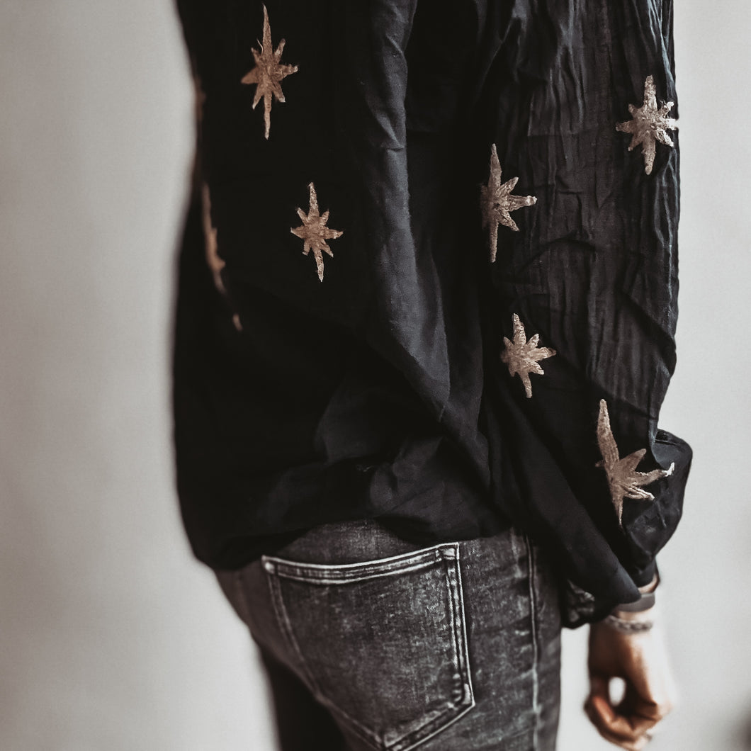 A super stylish blouse with a gorgeous embroidered stars that will look great worn with my ultimate joggers or jeans for a smarter day or evening look. Hangs beautifully. Wear tucked in or out.