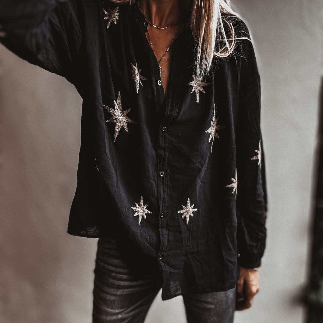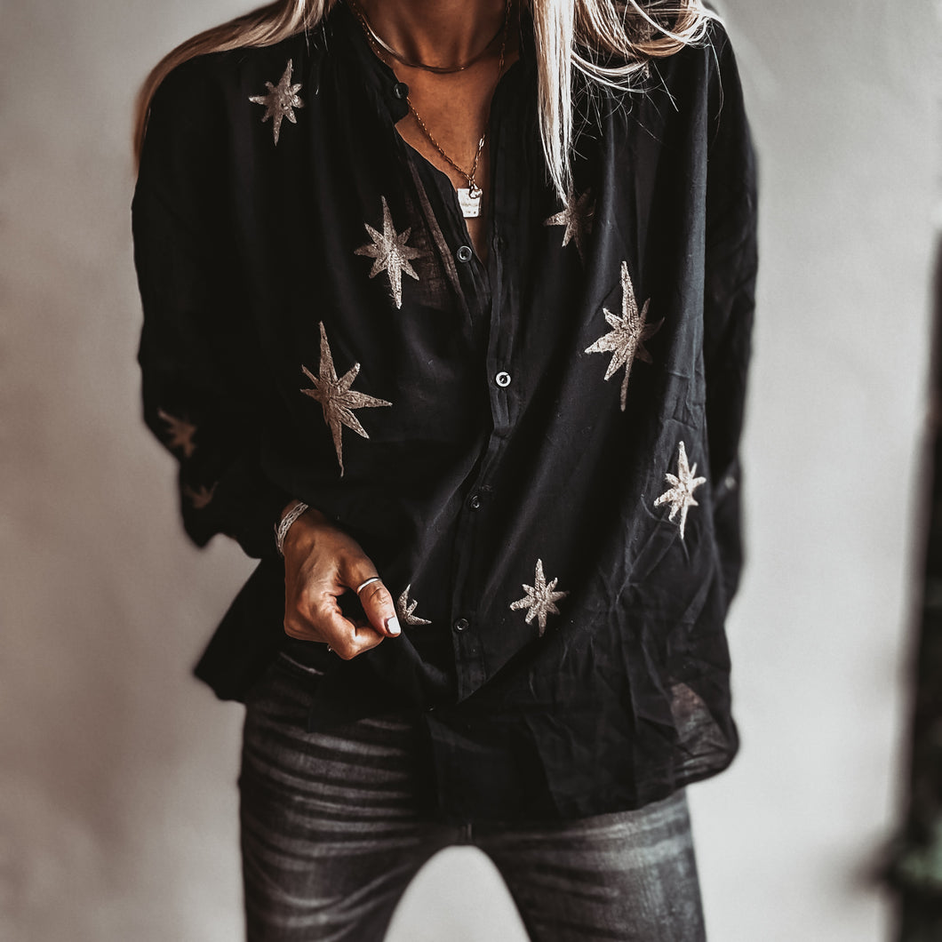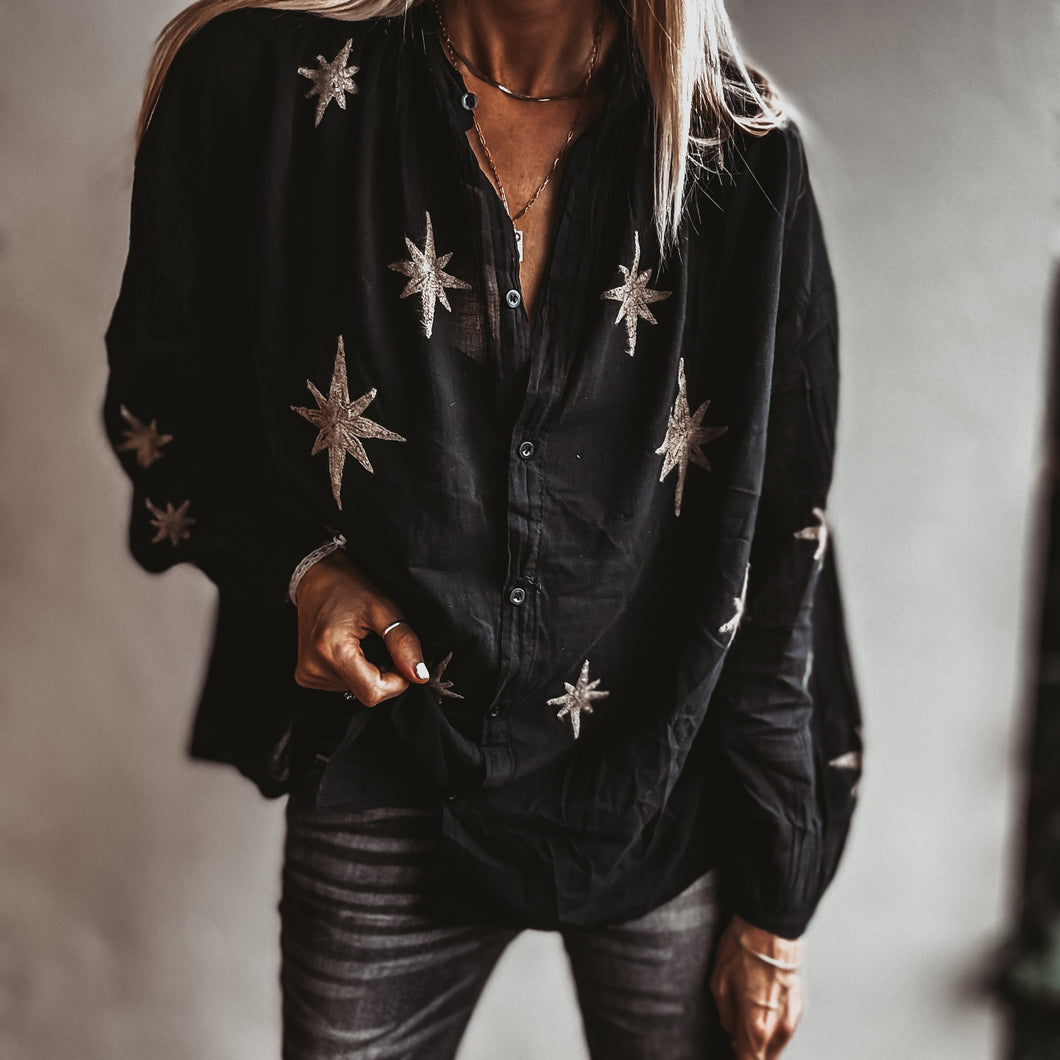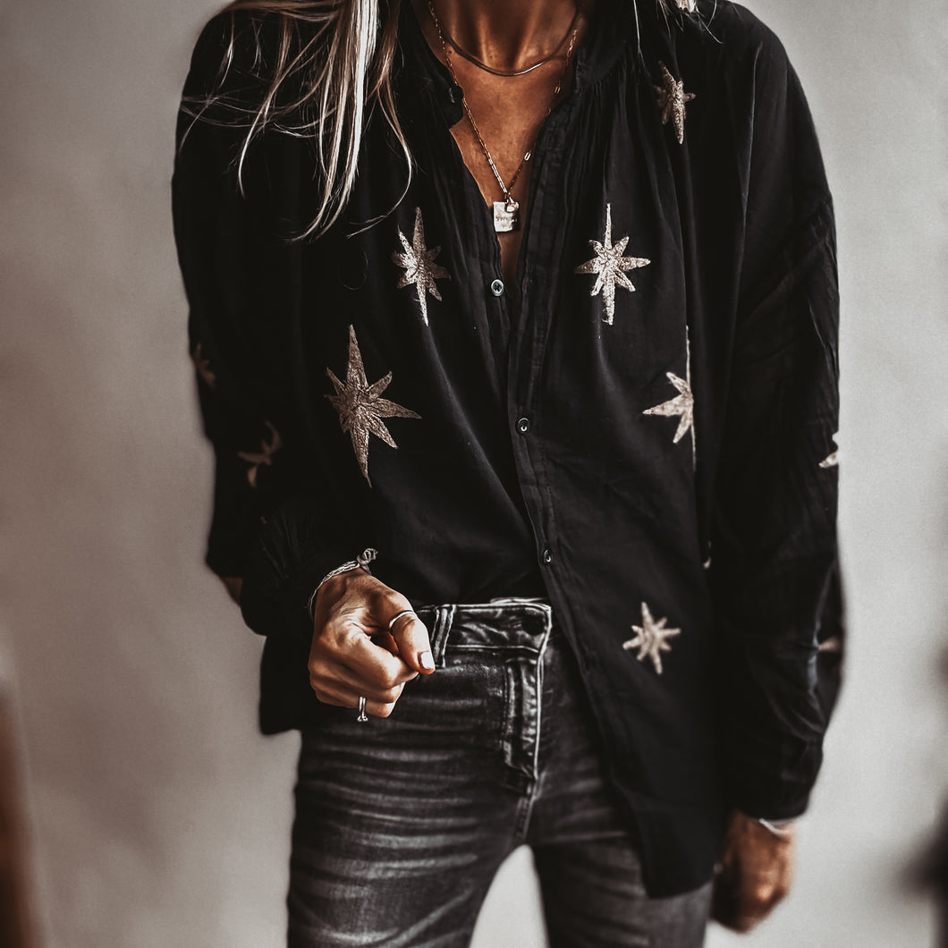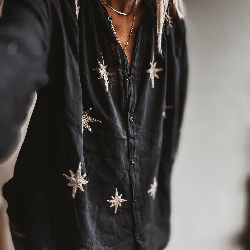 A super stylish blouse with a gorgeous embroidered stars that will look great worn with my ultimate joggers or jeans for a smarter day or evening look. Hangs beautifully. Wear tucked in or out.
