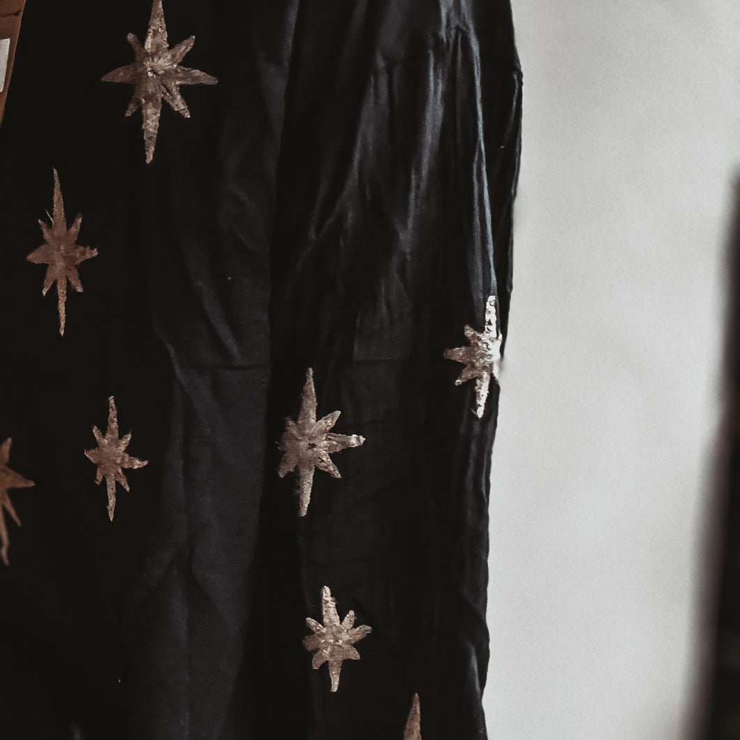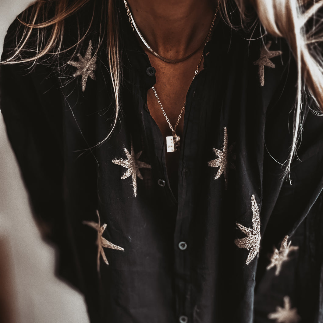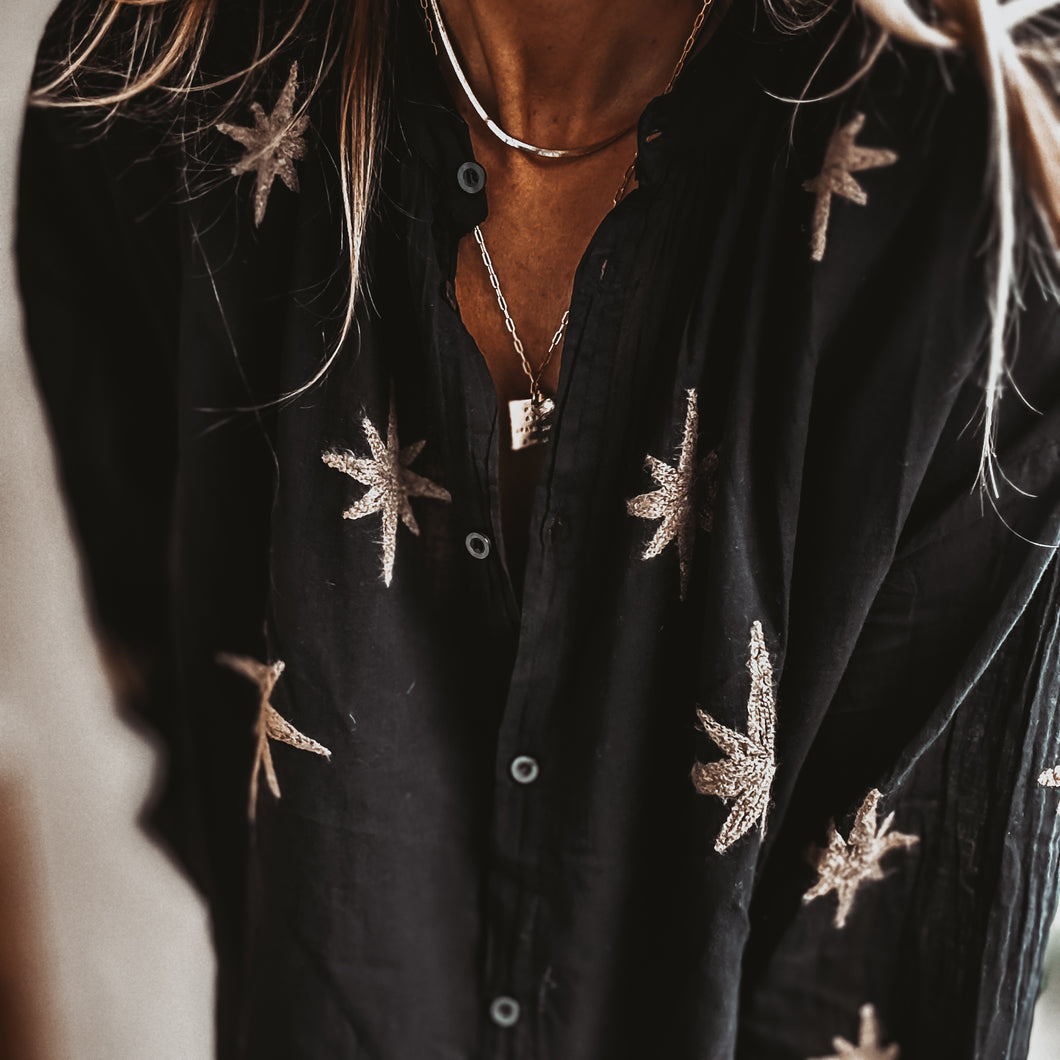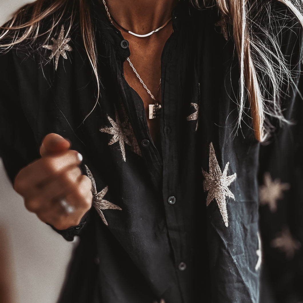 A super stylish blouse with a gorgeous embroidered stars that will look great worn with my ultimate joggers or jeans for a smarter day or evening look. Hangs beautifully. Wear tucked in or out.