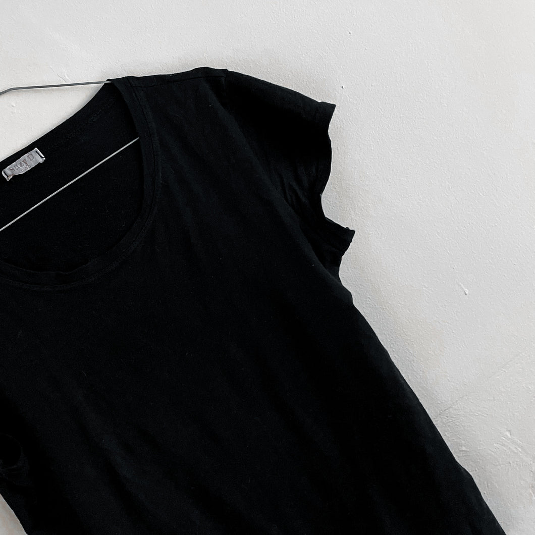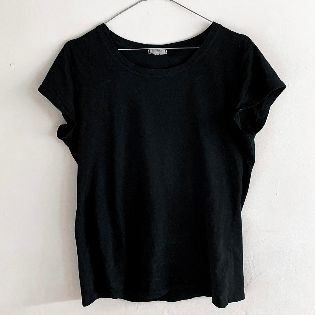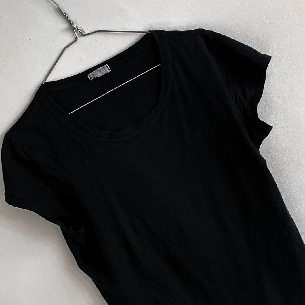 A Lovely wide neck & dipped hem. Not too tight and hangs beautifully. Comes up on size. I am a size 12 and wear the medium.
