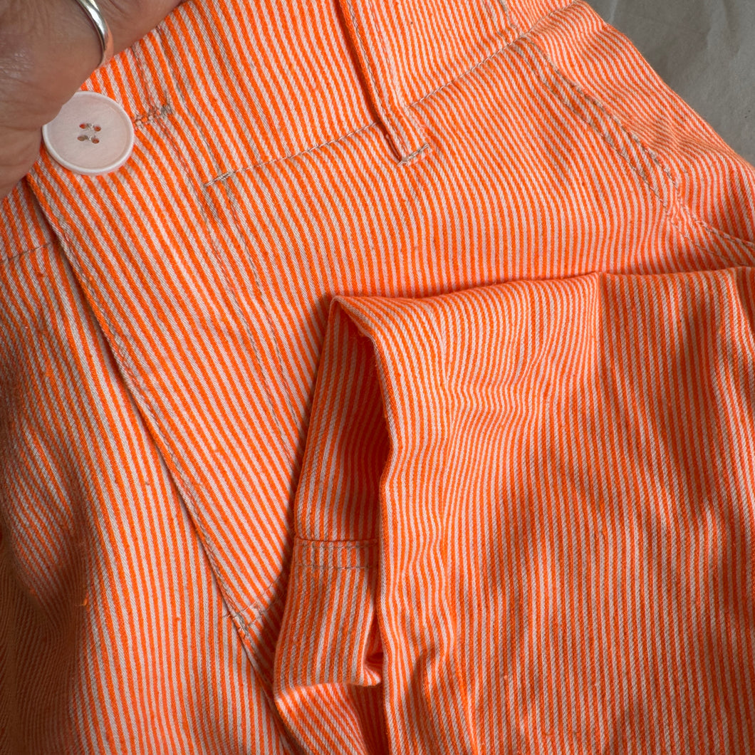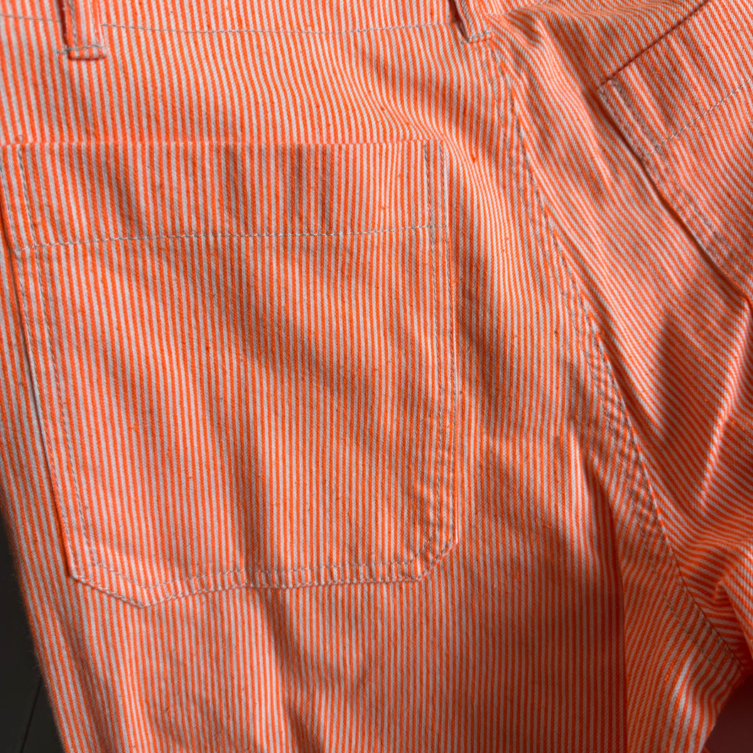 We are obsessed with these new neon orange jeans! Slightly barrel shaped. Pockets on the front and back. Fab with white or grey.